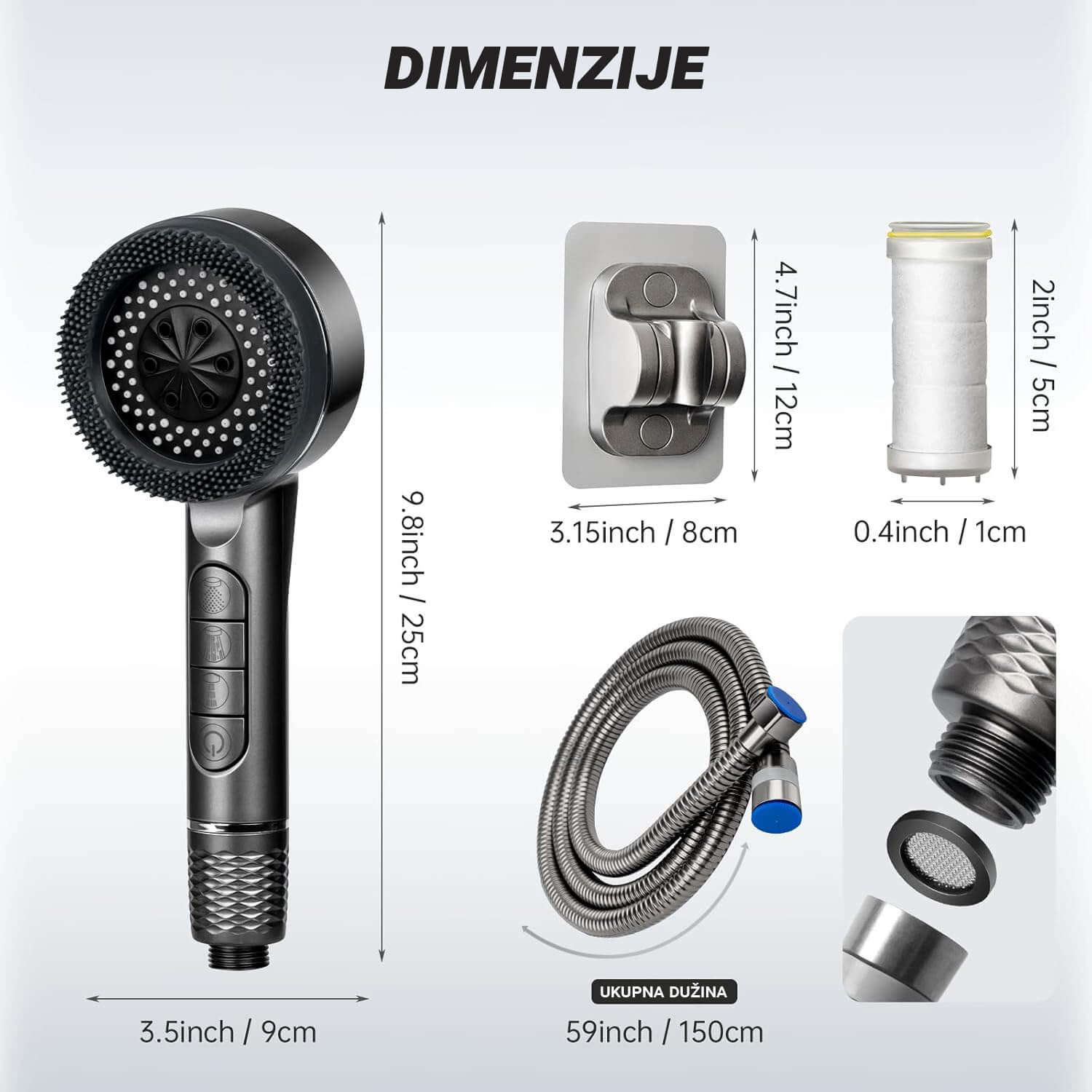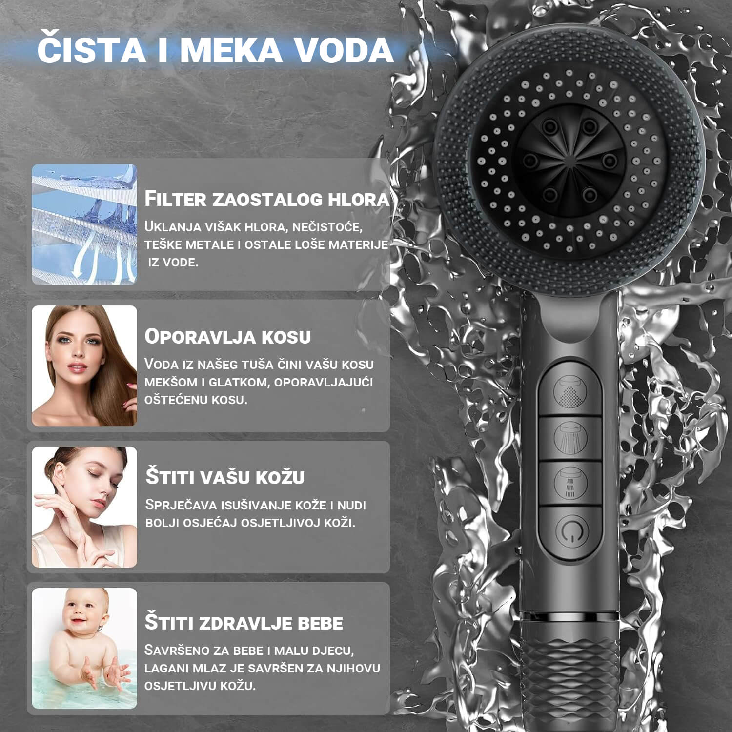 Ugrađeni filter uklanja nečistoće, hlor i kamenac iz vode, čineći je sigurnijom za tvoju kožu i kosu. Manje iritacija, zdravija kosa i osjećaj svježine nakon svakog tuširanja.