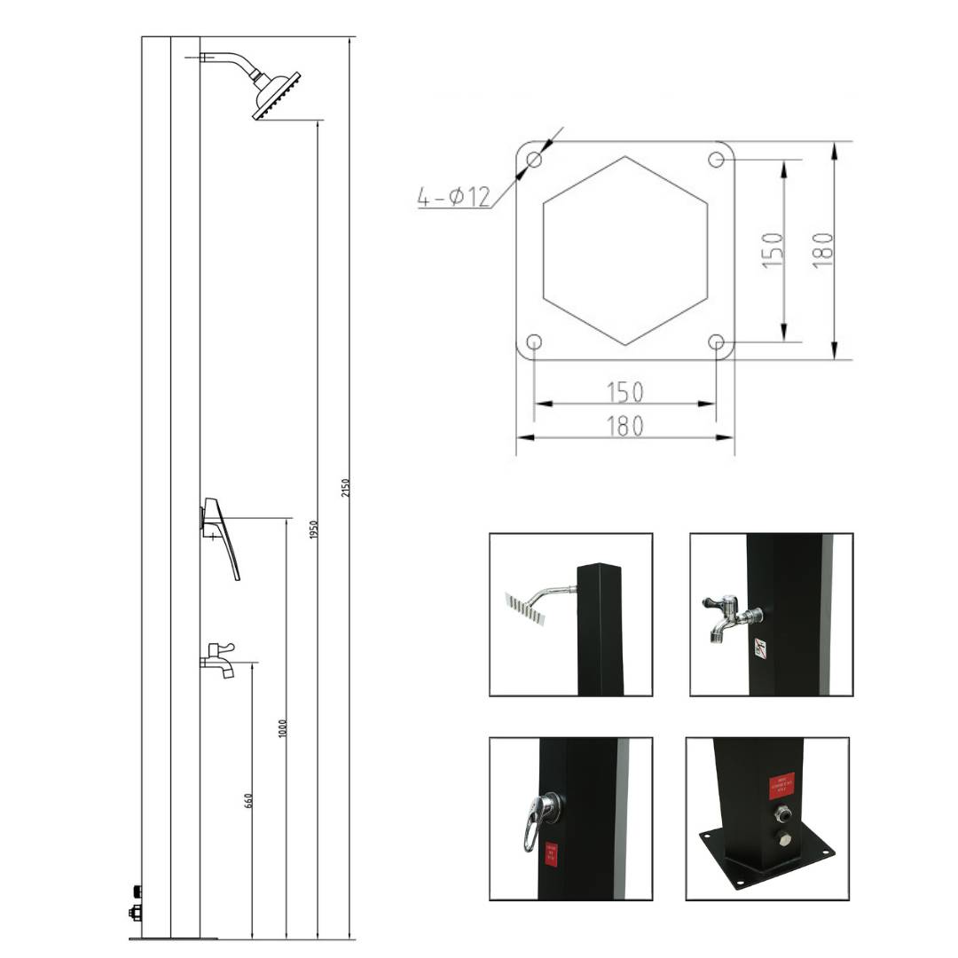 📦 Pakovanje sadrži: solarni tuš, glavu za tuširanje, donju slavinu, montažni pribor.