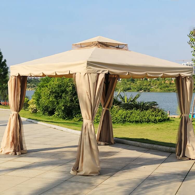Čvrsta metalna konstrukcija osigurava stabilnost i dugotrajnu upotrebu, dok vodootporni krov sa UV zaštitom štiti od sunca i lagane kiše. Dvoslojni, ventilirani krov poboljšava protok zraka i smanjuje zadržavanje toplote. Odvojene zavjese za komarce i protiv vjetra se mogu pojedinačno zatvoriti ili vezati za stubove za otvoreniji izgled.