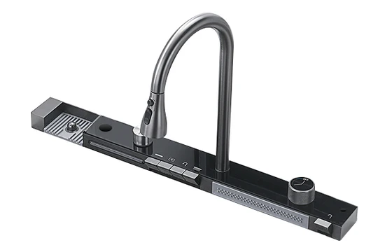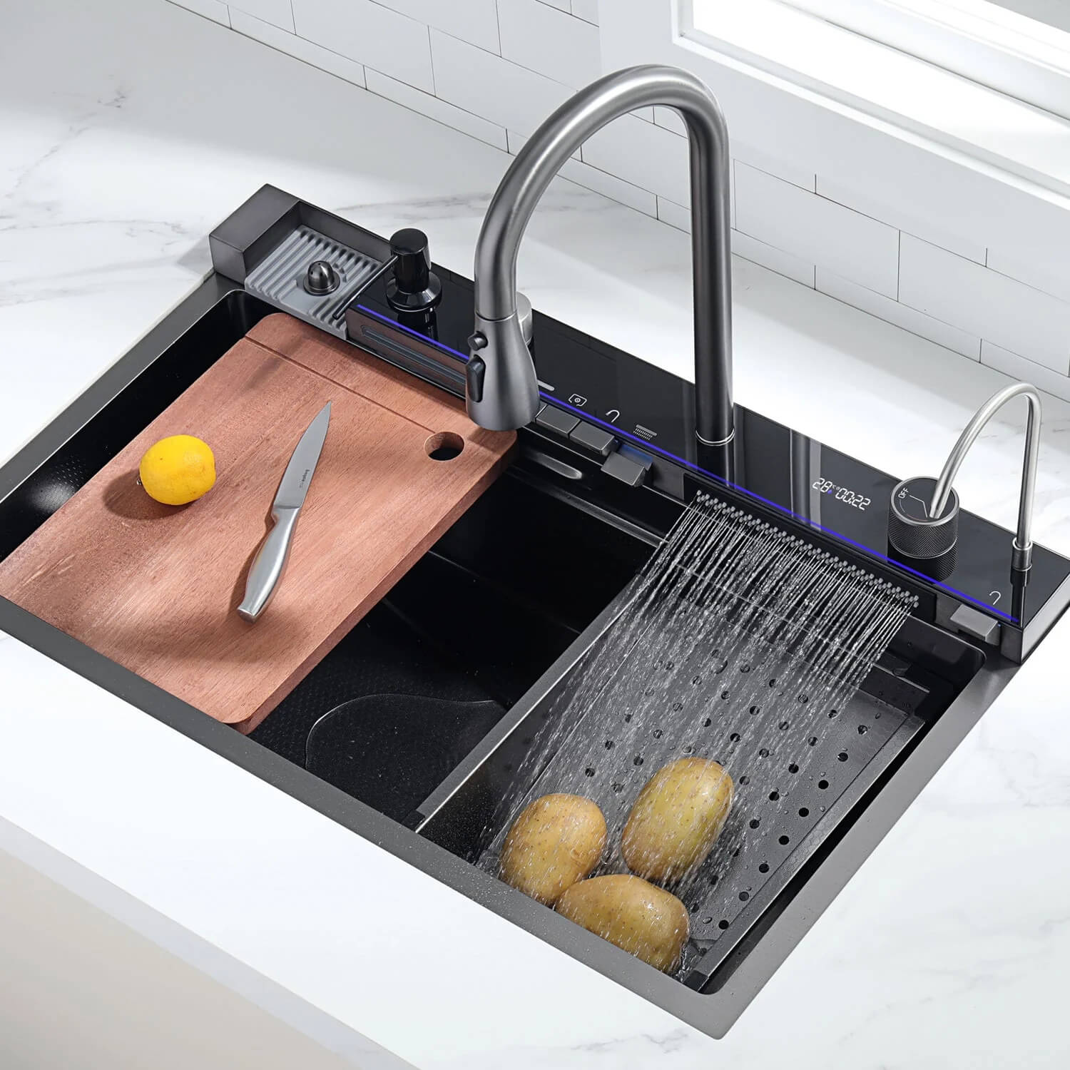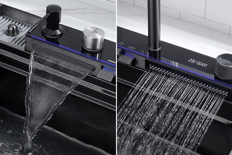 Luksuzna sudopera izrađena od nerđajućeg čelika sa nano premazom koji ne ostavlja fleke od vode ili masnoće, sa nekoliko česmi, dozatorom deterdženta, peračem čaša, LED osvjetljenjem i prikazom temperature vode.