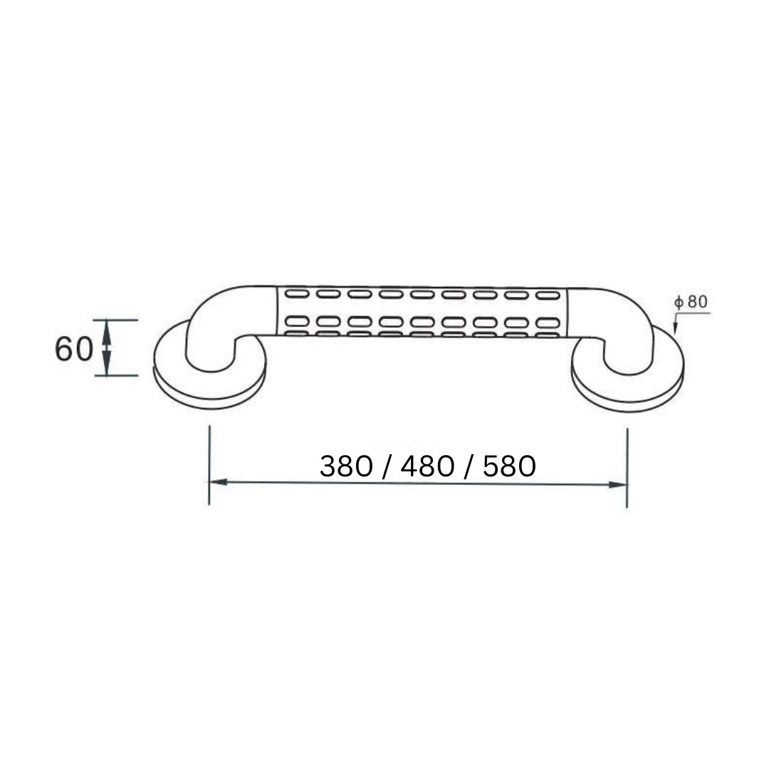 Antibakterijski najlonski rukohvat za osobe s invaliditetom izrađen je od kombinacije obojenog najlona i cijevi od nehrđajućeg čelika. Vanjski sloj najlona ima prečnik 36 x 3,5 mm, dok unutrašnja cijev od nehrđajućeg čelika ima prečnik 28 x 1,2 mm. Protivklizni dizajn s reljefnim tačkama debljine 0,5 mm omogućava čvršće držanje i veću sigurnost.