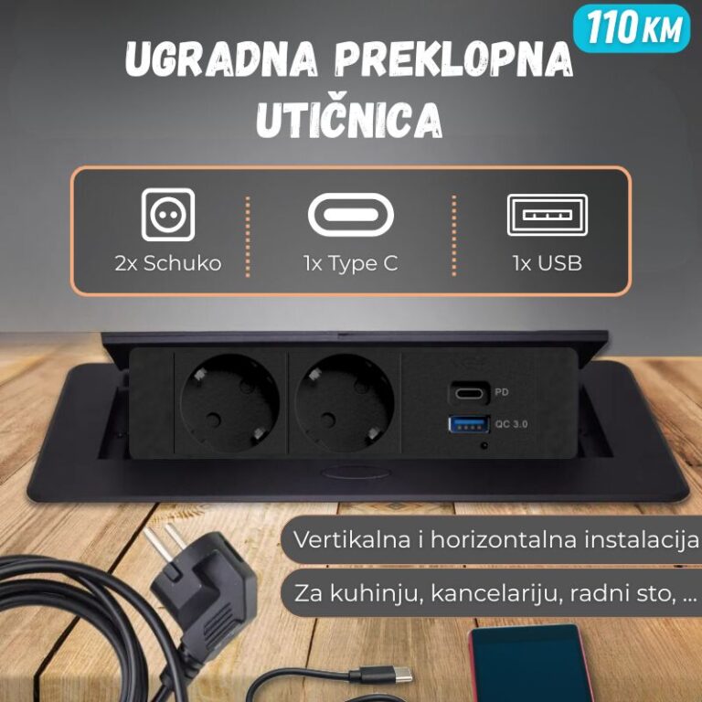 Ugradna preklopna utičnica za sto – 2x Schuko, USB + TypeC
